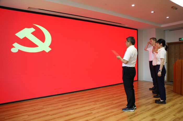 黨委副書記、監(jiān)事長(zhǎng)沈?yàn)槊駧ьI(lǐng)預(yù)備黨員入黨宣誓;
